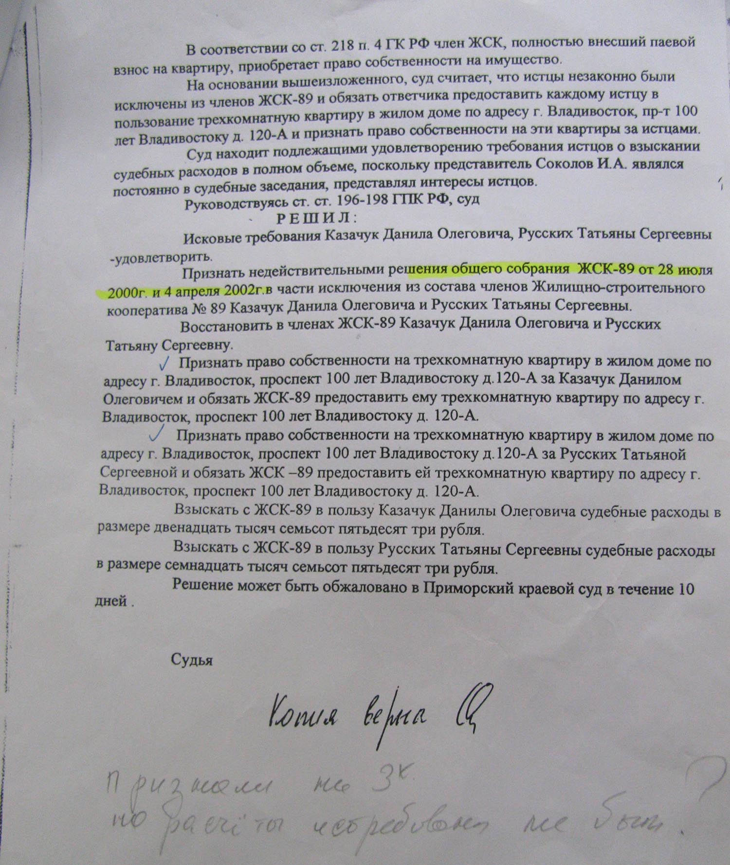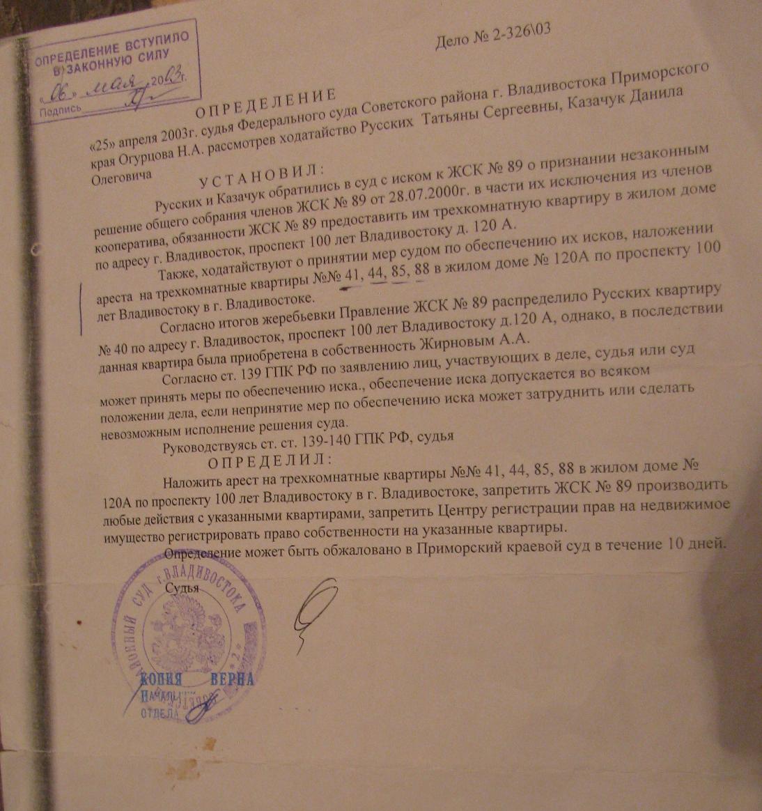 Исключенные за долги из членов ЖСК-89, мать и сын, Татьяна Русских и Данила Казачук, обратились в суд с иском о восстановлении их в членстве и наложении ареста на трехкомнатные квартиры №№ 41, 44, 85, 88 в доме 120 «А» по проспекту 100 лет Владивостока. По этому иску судья Советского райсуда Владивостока Огурцова приняла два решения. Сначала, 25 апреля 2003 года, она наложила арест на квартиры, а восстановить членство матери с сыном в ЖСК-89, видимо, забыла.