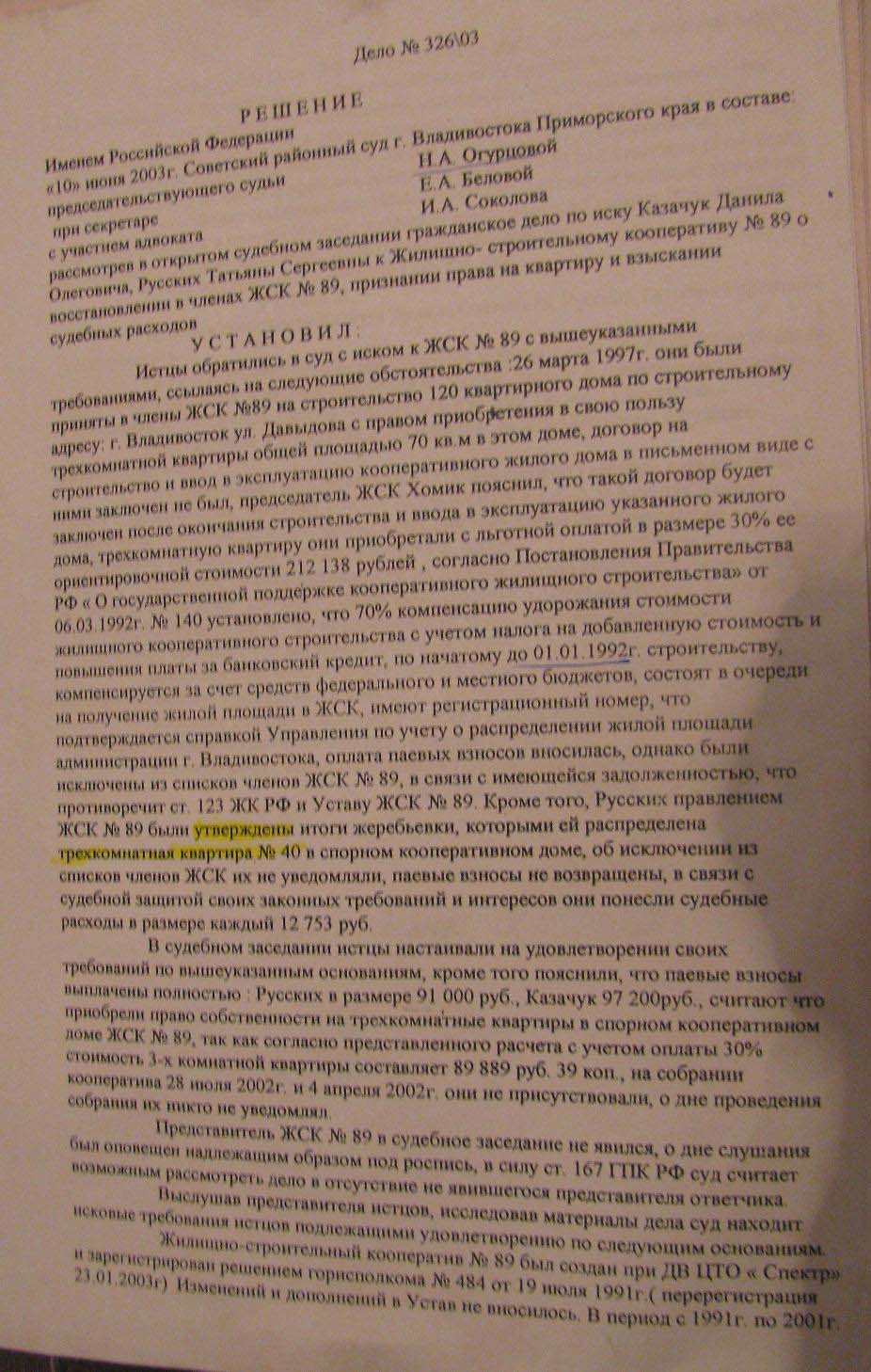 Эту ошибку она исправила, 10 июня 2003 года, вынеся решение о восстановлении Русских и Казачука в членстве исключительно на основании их устного заявления о полной оплате ими пая трехкомнатных квартир.