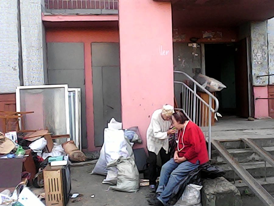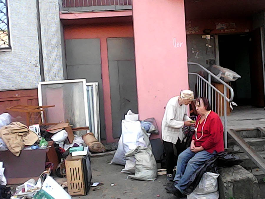 Сейчас рядом с ней знакомая старушка. Пытается как-то ее приободрить, а заодно и накормить. Галина Владимировна среди вороха белья и свалки мебели вызывает у соседей недоумение, многие останавливаются, спрашивают, что случилось. Некоторые приносят еду, другие спрашивают, чем помочь. Галина Долгих намерена жить возле подъезда до тех пор, пока мэрия не решит ее вопрос. Но при чем тут мэрия, если собственниками стали ее далекие родственники из Таганрога?