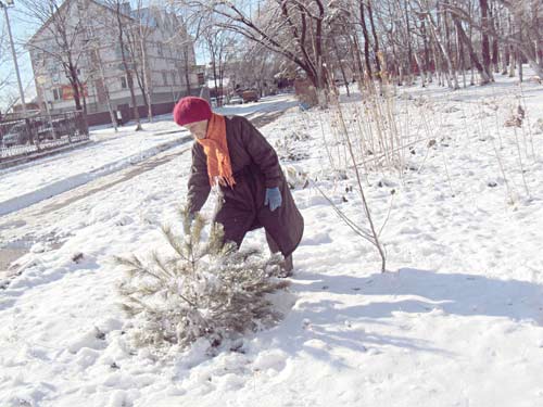 Вижу, как женщина подходит к сосенкам. Она наклоняется перед ними, и так нежно, бережно, словно боясь, что бесконечно изумрудные, пушистые молодые ветви не выдержат тяжести непривычного пока ещё первого снега, отряхивает его и улыбается.
