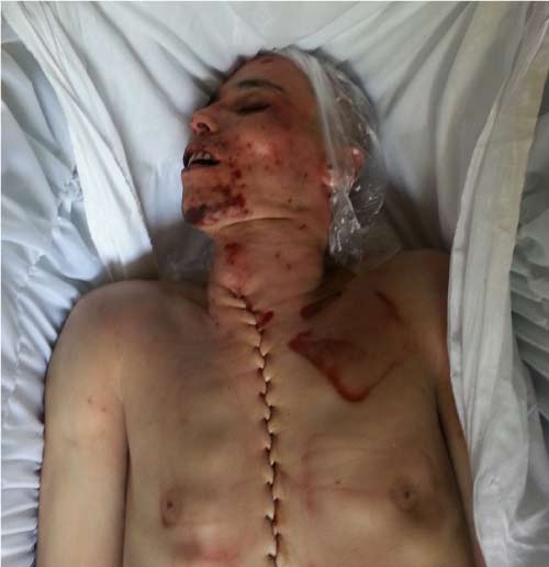 «Когда вчера в морге я увидела изуродованное тело Пармонова, меня охватил ужас. Из увиденного я сделала вывод, что он был растянут и в таком виде его избивали. У него все тело было синее, абсолютно черная мошонка, выбита челюсть вместе с зубами. Которую они попытались поставить на место, в связи с чем у трупа приоткрыт рот.. Страшно даже подумать о том, какие боли он испытывал и как тяжело он умирал».