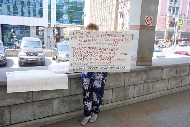 Жители г. Владивостока, гостинки Сахалинская, 34, вышли на пикет. После судов, которые прошли далеко не в пользу обыкновенных горожан, это единственный способ привлечь внимание общественности и властей. Пикетирование мэрии, а затем и администрации края – это акт отчаяния вследствие наглого отжима москвичами обыкновенной гостинки, первого этажа бывшего общежития Министерства обороны.