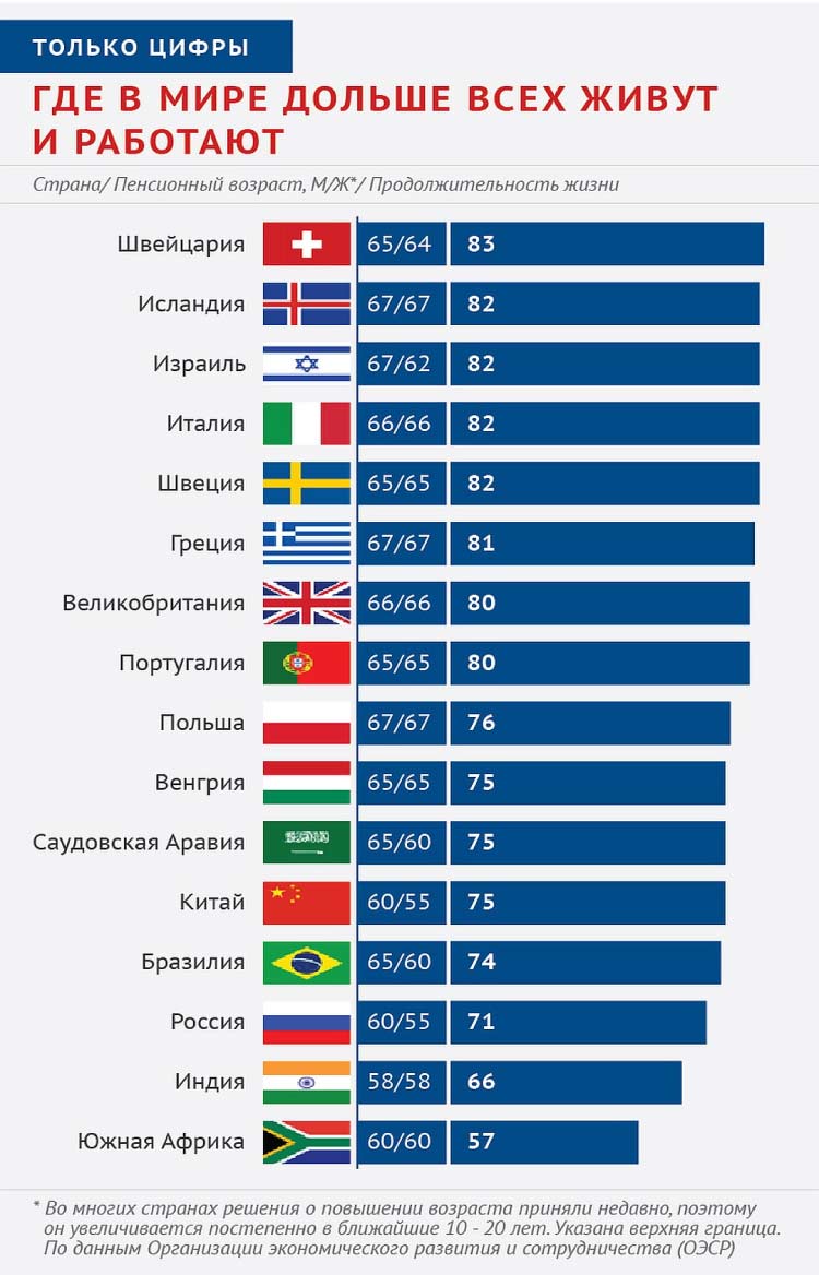 Предлагаем вам сравнить сложившуюся ситуацию с показателями пенсионного возраста в других странах.