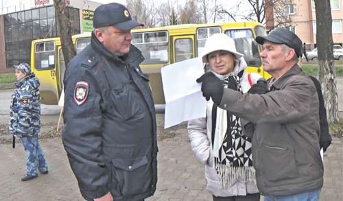 На фото Тимин Владимир 18.10.2015 разъясняет безграмотному майору полиции командиру ОВ ППСП ОМВД России по г. Березовскому Червинскому В.С. законодательство о публичных мероприятиях о том, что проведение митинга в специально отведенном месте с численностью 10 человек не требует никаких согласований от местной администрации (фото: Правозащитники Урала).