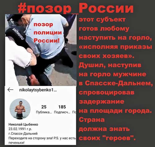 «АрсВест» распространяются не только в Приморье, но и в Хабаровском крае, Санкт-Петербурге и в Москве. Социальные же сети, в которых очевидцы насилия в Спасске над мирными гражданами рассказывали пикантные детали, типа призыва в Инстаграмме того самого полицейского, которым придавил горло Виталия Колбина коленом, Николая Цыбенко (аккаунт nikolaytsybenk1): «Переходите на сторону зла! P.S. У нас есть печеньки», – моментально разнесли весть о нарушении прав человека в Спасске по всему миру.