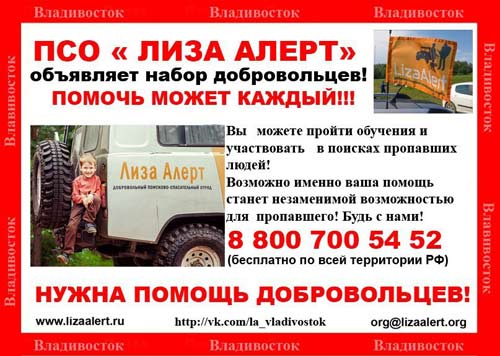 «Чужой беды не бывает, – уверена координатор недавно созданного поисково-спасательного отряда «Лиза Алерт – Владивосток» Юлия Кульбаева. – Только объединившись, мы сможем помочь спасти чью-то жизнь».