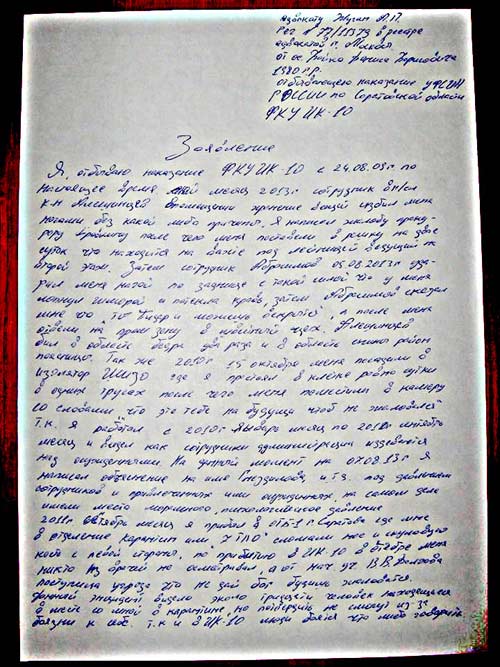 «Я отбываю наказание в ИК-10 с 24.08. 09, – сообщил Денис Бойко. – Сотрудник колонии Алешинцев однажды избил меня в помещении для хранения вещей без всякой причины. Я написал жалобу прокурору, после чего меня поместили в «Решку» (камера, в которой можно только стоять – прим. авт.) на двое суток. Потом сотрудник колонии Абрамов избил меня ногой и сказал, что я могу вскрыться (т.е. вскрыть себе вены или живот – прим. авт.). Меня поместили в изолятор – ШИЗО, где я простоял в клетке ровно сутки в одних трусах. После этого меня выпустили со словами, что я получил урок на будущее, и это в наказание, чтобы я больше не жаловался. С января 2010 года по сентябрь 2011 года я видел, как сотрудники колонии издевались над другими осужденными. Я написал объяснение на имя Гнездилова. А когда меня привезли в ОТБ-1 города Саратова, в отделении карантина мне сломали нос и скуловую кость с левой стороны. Потом меня возвратили в ИК-10, но никто из врачей колонии меня не осматривал. Вместо этого начальник В.В. Долгий сказал, что не дай Бог я буду жаловаться».