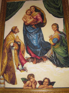 И главная, на мой взгляд, изюминка выставки в том, что яркой и духовно очень значимой доминантой ее является непревзойденная «Сикстинская мадонна» Рафаэля, вышитая Лидией Васильевной Иващенко, ныне, к сожалению, ушедшей из жизни. Сей величайший шедевр Рафаэля, донесенный до нас талантливой приморской вышивальшицей, побуждает о многом вспомнить, задуматься и, конечно, помолиться в душе своей.