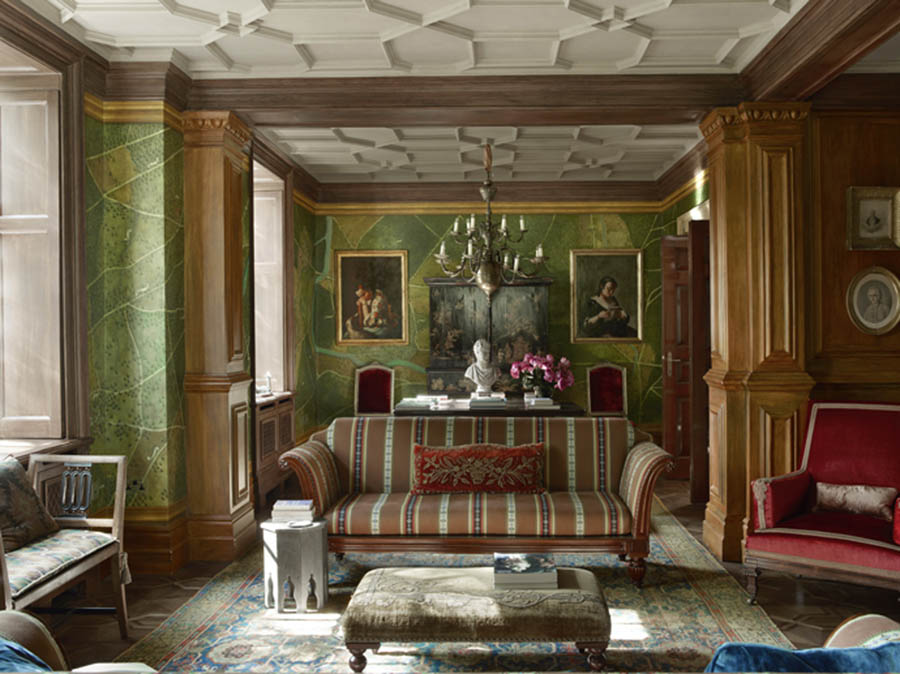 Грамотная планировка, ненавязчивый декор и удачная расстановка акцентов берут начало не только из ассоциаций с русскими дачами. Вдохновившись большим по площади пространством (250 кв. м) и оценив его возможности, дизайнеры выбрали не прованс или скандинавский стиль, популярные в Петербурге, а более деликатный и сдержанный модерн, ведущее стилевое направление рубежа XIX-XX веков. Изразцы в ванной и на кухне, кованые светильники, мебель под винтаж, растительные мотивы на стенах — все эти элементы, блестяще реализованные в проекте, присущи стилю модерн, не утратившему актуальности и в наши дни. В интерьерах дома в Комарово формы, свойственные эстетике ар-нуво, воплощаются в тщательно подобранной европейской мебели и светильниках. Выразительная плитка на полу в зоне кухни и роскошный камин с узнаваемым цветочным узором ар-нуво в гостиной также идеально вписываются в общую стилевую концепцию. Излюбленные художниками и декораторами модерна цветы и птицы возникают на стенах, в рисунке обоев Borastapeter. Теоретически такие обои могли украшать загородные интерьеры в России еще до революции: стены комнат многих петербургских и московских домов-музеев и особняков, когда-то принадлежавших аристократам и интеллектуалам, оформлялись похожими изображениями лепестков, стеблей, веток и листьев.