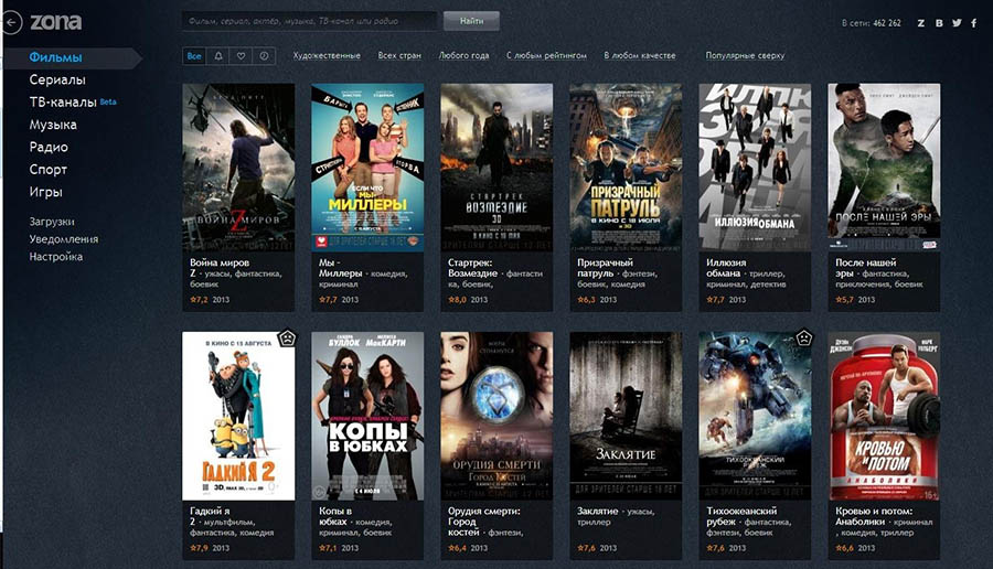 Главное окно торрент-клиента Zona представлено в виде трех основных разделов, которыми являются музыка, фильмы и сериалы. Здесь любая картинка дается с подробным описанием сюжета, а список актеров ― в виде перечня интерактивного, где, нажимая на определенную фамилию актера, дается информация о том, в каких кинофильмах он уже снялся. К важной особенности торрент-клиента Zona также стоит отнести сегмент геймеров, где пользователи могут поиграть в различные онлайн-игры.