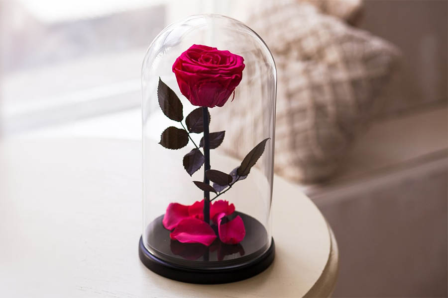 Внутри стеклянного сосуда находится стабилизированное живое растение, которое будет радовать цветением и ароматом свежесрезанного букета до восьми лет. Такой презент не оставит равнодушной любую девушку.