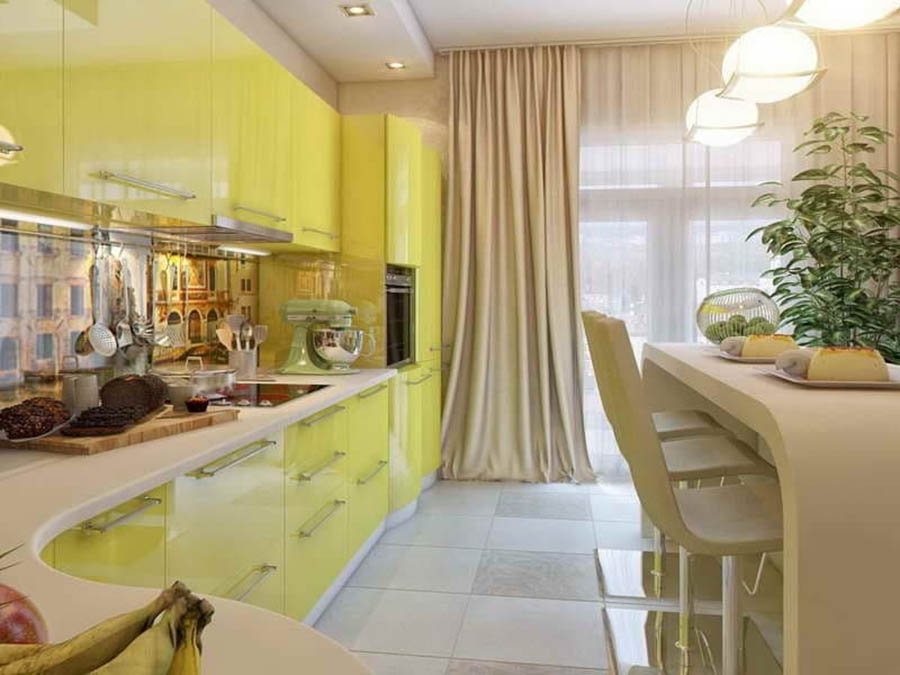 Зеркальные или глянцевые поверхности отражают предметы вокруг, что дает большой эффект «расширения» пространства. Натяжной глянцевый потолок или напольная плитка способны увеличить площадь кухни практически в 2 раза. Отличный результат дает и мебель в которую встроены части зеркальных поверхностей или гарнитур имеющий отражающие плоскости.