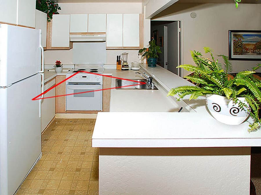 Свободное перемещение межу зонами можно представить в виде треугольника, где каждая вершина отвечает за определенную область. В идеале в такой треугольник не должны попадать никакие другие предметы мебели или декора.