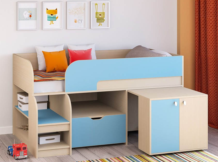 Оптимальные габариты кровати-чердака позволяют гармонично совмещать не одно спальное место. Система укомплектована рабочим столом с тумбами, удобным диванчиком и ящиком для хранения личных вещей. Некоторые модели имеют пространство под кроватью, что позволяет ребенку самому обустроить свой уголок.