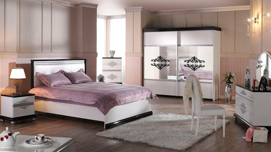 - Спальный гарнитур. Комплект всех необходимых атрибутов спальной комнаты включает: туалетный столик с зеркалом, комод, шкаф, прикроватные тумбы, трюмо.