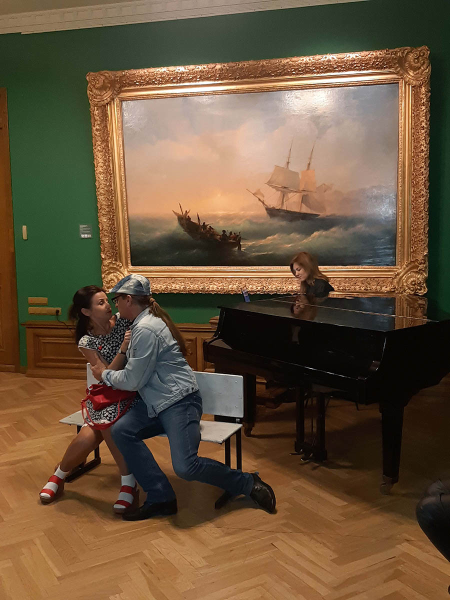 Спектакль «Cкамейка» по пьесе советского драматурга Александра Гельмана идет с успехом более 30 лет, и впервые декорацией для него явился шедевр Айвазовского. Артисты Театра Андрея Нартова представили этот камерный спектакль в зале маринистики. «Мы уже здесь в третий раз, - сказал режиссер и актер Андрей Нартов. – Мы рады такой возможности выступать на разных площадках». Понравилось и артистам, и зрителям. Все пришедшие в этот вечер в картинную галерею получили массу впечатлений, креативные сотрудники галереи совместно с артистами подготовили увлекательную программу.
