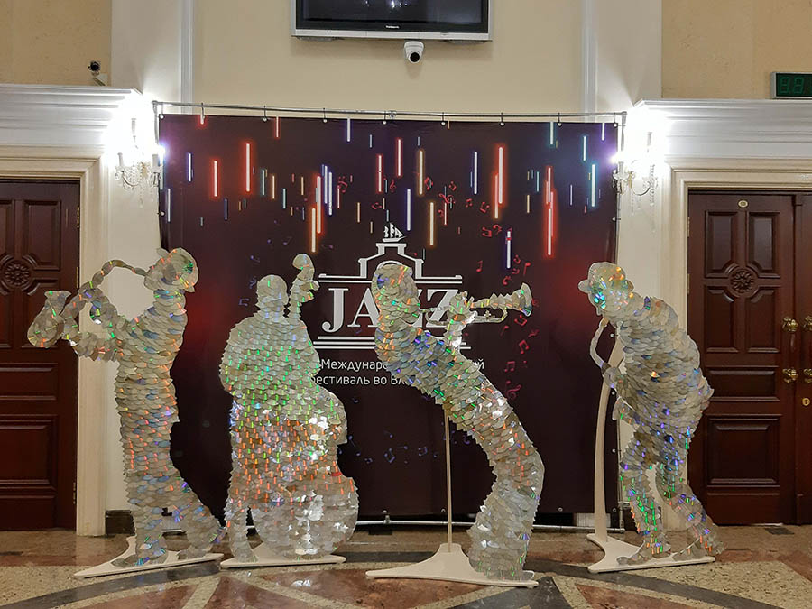 В фойе филармонии появилась интересная фотозона – «блестящие человечки», эта идея принадлежит дизайнеру филармонии Андрею Степаненко. «Вначале родилась идея поставить фигуры музыкантов, потом решили сделать их блестящими, вот и придумали украсить лазерными дисками, выбрали вариант орнамента, напоминающий рыбью чешую: город-то морской!» - говорит Андрей.