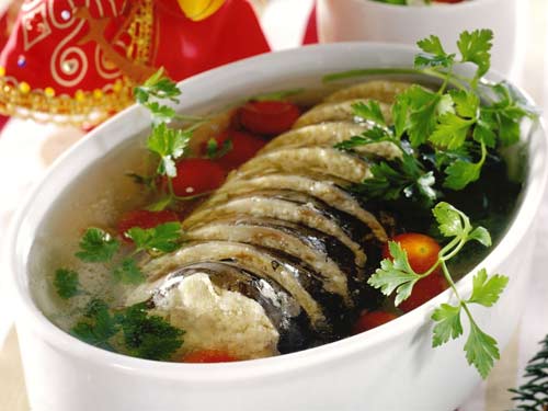А можно и совсем отказаться от горячего блюда за новогодним столом и оставить его на следующий день, а в новогоднюю ночь обойтись холодными закусками и легким десертом. Кстати, заливная рыба из любимого россиянами фильма «Ирония судьбы, или С легким паром!» с точки зрения диетологии легкое и полезное блюдо.