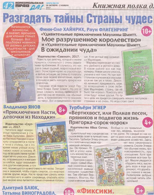 Мне очень приятно, что моя книга сейчас стоит на прилавках главных книжных магазинов нашей страны, активно продаётся в Интернете, что с девочкой Настей из города Находка познакомятся ребята всей страны. Большим сюрпризом для меня стало обнаружение в «Комсомольской правде» - толстушке за 26 октября прошлого года хорошую заметку о моей Насте.