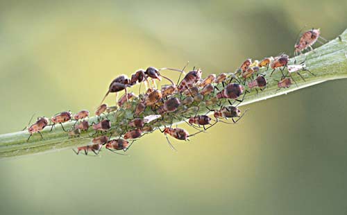 Для тли характерен симбиоз с муравьями. Некоторые муравьи «пасут» тлю и получают от неё взамен выделения, содержащие сахар.Муравьи переносят тлю на новые непоражённые растения для размножения.Могут содержать её у корневой системы растений в земле.