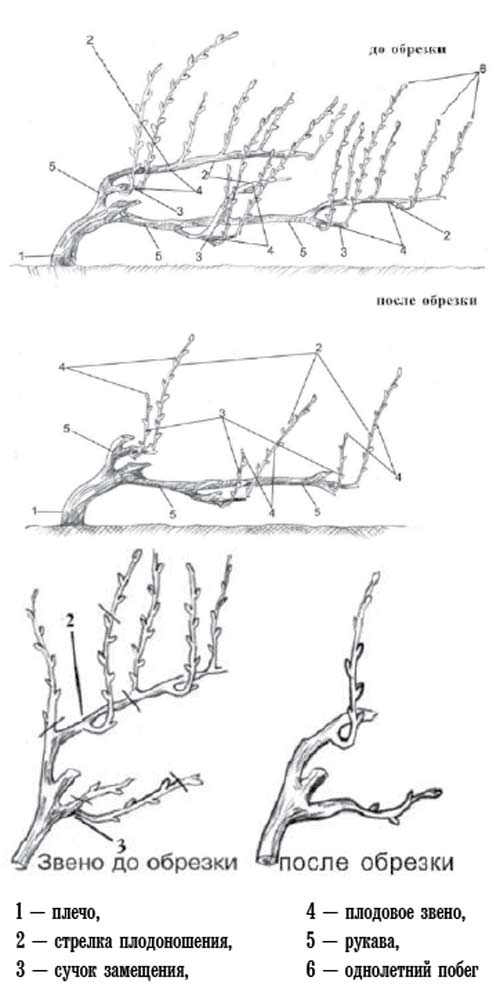 В виноградном кусте различают старую и молодую части стебля. Старая часть — это многолетние ветви, составляющие скелет куста, — или рукава [5], а молодая часть — это прошлогодние побеги (стрелки плодоношения [2] и сучки замещения [3]) и побеги текущего года [6].