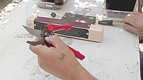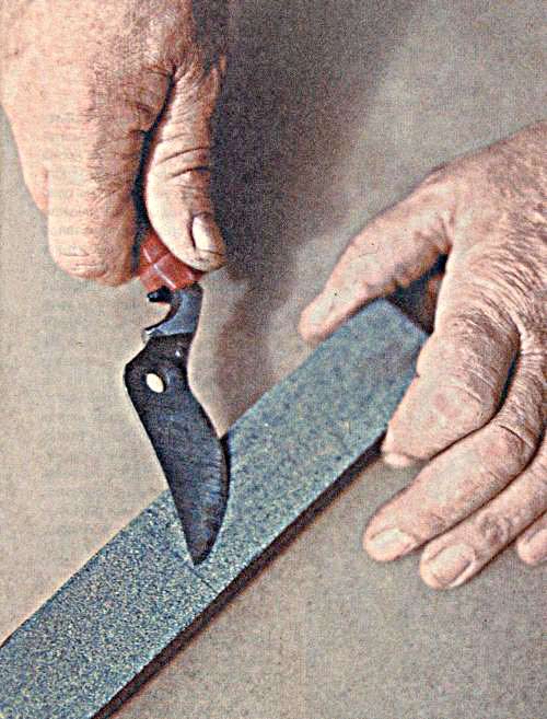 Точат также и торцовую вогнутую сторону опорной части, если ее ребро затупилось. Собирать секатор нужно в закрытом состоянии. Гайку соединительного болтика завинчивают до тех пор, пока пружина еще способна открыть секатор.