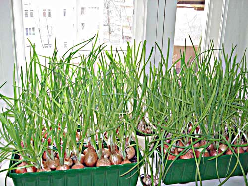 Для выгонки зелени лука лучше обзавестись 5 одинаковыми ванночками-кюветами, которые удобно располагались бы на подоконнике. Для конвейерной выгонки наиболее удобны луковицы небольшого размера или лук-выборок. Срок выгонки — 20-21 день. Через каждые четыре дня заполняем одну кювету субстратом и высаживаем в нее луковицы плотно друг к другу, мостовым способом.