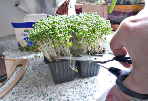 Для выгонки зелени достаточно посеять семена в мелкую тарелку на вату, смоченную водой. Через семь дней, когда растения достигнут высоты 6-7 см, их надо состричь ножницами и тут же посеять новые семена. Можно выращивать кресс-салат в кюветах и цветочных горшках с небольшим слоем почвы (5-8 см).