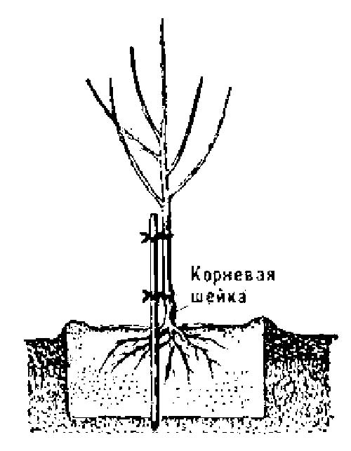 Если грунтовая вода отстоит от уровня поверхности почвы не глубже 1,5 м, приходится делать посадку на поднятых почвенных холмиках. Вначале в месте посадки почву надо вскопать на штык лопаты, затем насыпать из хорошей удобренной почвы холмик высотой 40-50 см, шириной не менее 1 м. На этот холмик и следует посадить саженец, подвязав его к предварительно прочно вбитому колу.