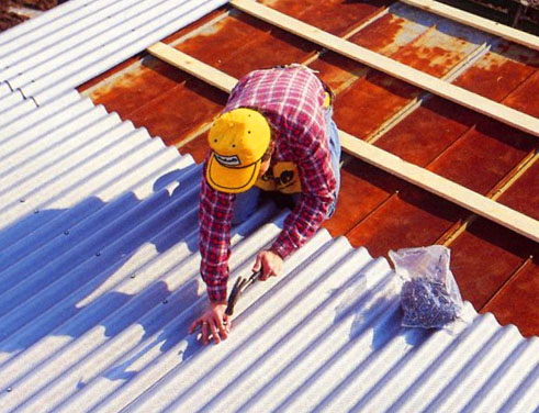 Если на даче нет электричества, отверстия для болтов желательно просверлить заранее. Если такой возможности нет, захватите с собой несколько острых дюпелей и плоскогубцы. Чтобы исключить риск удара по пальцам, в процессе пробивания дырки, дюпель лучше держать плоскогубцами. Для того чтобы при пробивании края металла не заворачивались вниз слишком сильно, под ребро листа можно подложить деревянный брусок, схожий по форме с ребром кровельного листа, так чтобы та часть ребра которую вы пробиваете, обратной стороной плотно лежала на деревяшке.