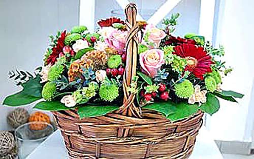 Главное отличие ее от букета состоит в том, что для цветов, собранных в композицию и установленных в оригинальные корзинки, чаши или блюда, не требуются вазы. Элементы цветочной композиции подготавливаются и крепятся на влажной флористической губке (биофлоре), которая в корзине кажется абсолютно незаметной.