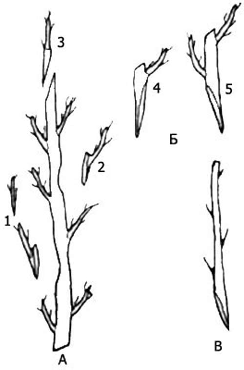 А – прошлогодний побег с побегами текущего года (1 – укороченный боковой черенок; 2 – более длинный боковой черенок; 3 – верхушечный черенок с частью прошлогоднего побега), Б – черенки с частью прошлогоднего побега (4 – с одним побегом текущего года; 5 – с двумя побегами); В – черенок текущего года с одревесневшим основанием.