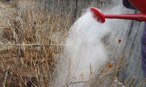 Растение благодаря такому поливу быстрее просыпается, листочки появляются чуть раньше, и земля под этим кустом также быстрее прогревается.