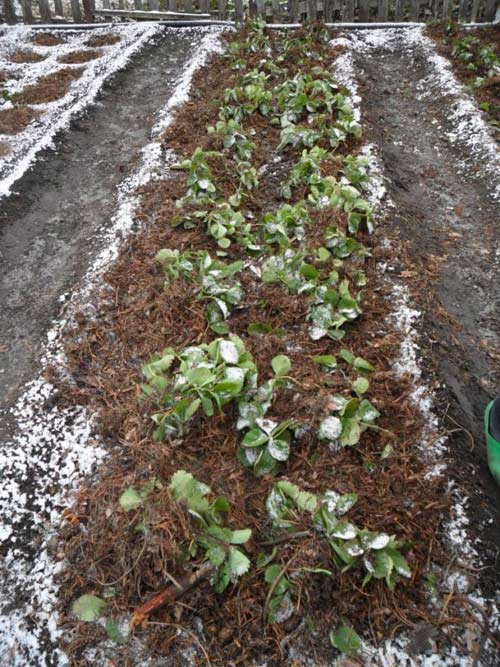 Пришло время убирать зимние укрытия. Когда на кустиках земляники начинают появляться первые зеленые листочки, которые можно наблюдать через укрывающий материал, укрытие постепенно снимают. После снятия укрытия необходимо провести неглубокое рыхление почвы на земляничных грядах.