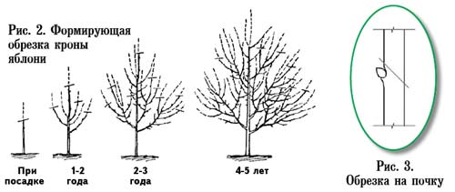 Саженцы разного возраста укорачивают по-разному. У однолетки, укорачивая побег, мы закладываем крону будущего дерева с желаемой высотой штамба. У двухлетки оставляем нужное количество правильно расположенных ветвей, придаем центральному проводнику лидирующее положение в кроне. До тех пор, пока крона полностью не сформирована, в ней необходимо добиваться соподчиненности ветвей друг с другом и с центральным проводником и ликвидировать побеги-конкуренты. После того как скелет дерева сформирован, размеры крон ограничивают, удаляя часть центрального проводника и укорачивая ветви.