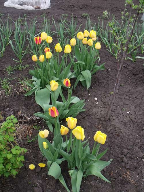 Не засыпая борозд землей, между ними делают канавки, глубиной приблизительно 6-8 см (расстояние, равное высоте трех луковиц тюльпанов). Эти борозды также опудриваются золой, после чего в них сажают луковицы тюльпанов.
