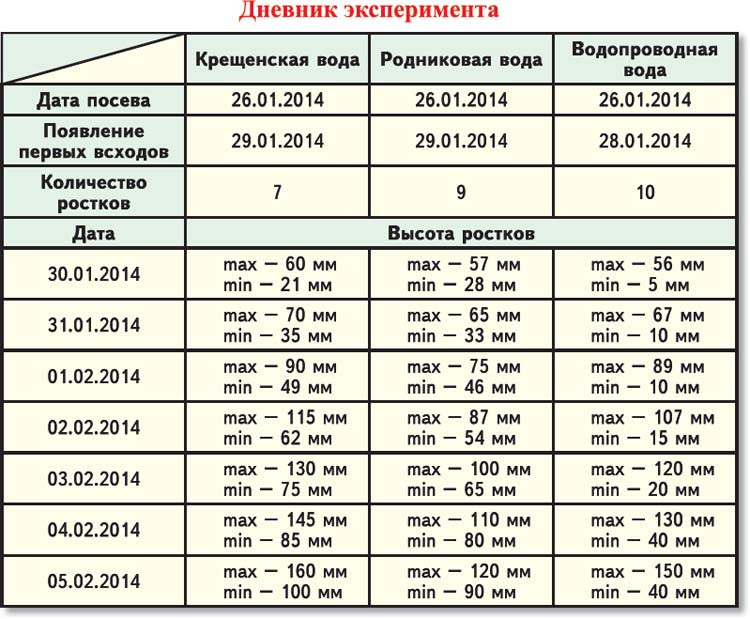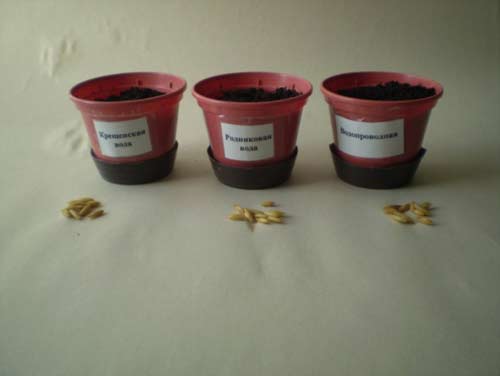 Может ли крещенская вода влиять на рост и развитие растений? Пять лет назад этот вопрос заинтересовал учащегося одной из школ г. Элисты. Под руководством своего учителя он по всем правилам поставил опыт. Этот опыт, если, конечно, он покажется вам интересным, вы, дорогие читатели, сможете повторить у себя дома. Можно использовать семена и других культур. В этом опыте, как и в любом другом, важно, чтобы у вас были контрольные растения. Результаты ваших экспериментов присылайте в редакцию, самые интересные из них мы опубликуем в рубрике «Земля-кормилица».