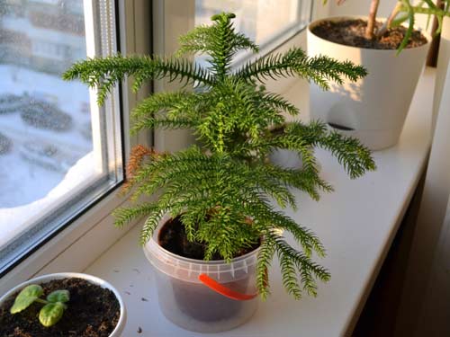 Полив требуется регулярный, после подсыхания грунта. Опрыскивать надо обязательно, не реже одного раза в день. Весной частоту поливов следует увеличить, не забывая делать регулярные подкормки комплексными минеральными удобрениями. Араукария ценит яркий свет, но может развиваться и при небольшом затенении.