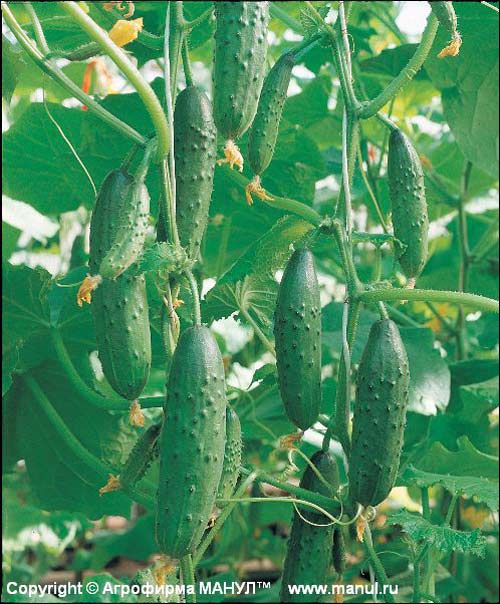 Это популярный раннеспелый гибрид (вызревание на 40-45 день) для выращивания в открытом грунте, в пленочных теплицах и под временными пленочными укрытиями. Раннеспелый, партенокарпический, салатный, консервный. Растение среднерослое, детерминантное, женского типа цветения, с пучковым заложением завязей – образуется по 6-7 завязей. Показывает неплохую урожайность – до 9 кг с метра. Устойчив к болезням. Обладает отличными вкусовыми качествами, горечь отсутствует.