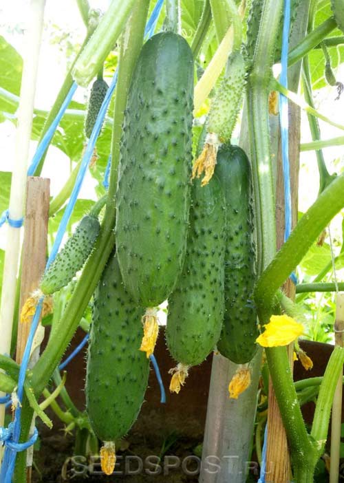 Первые огурцы этого гибрида поспевают уже на 40-45 день. Прекрасно растет в теплицах, в том числе и поликарбонатных. Урожайность товарных плодов – 12-16 кг/м2. Имеет ярко выраженный вкус и прекрасно подходит для летних салатов.